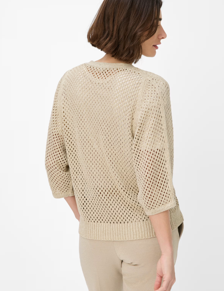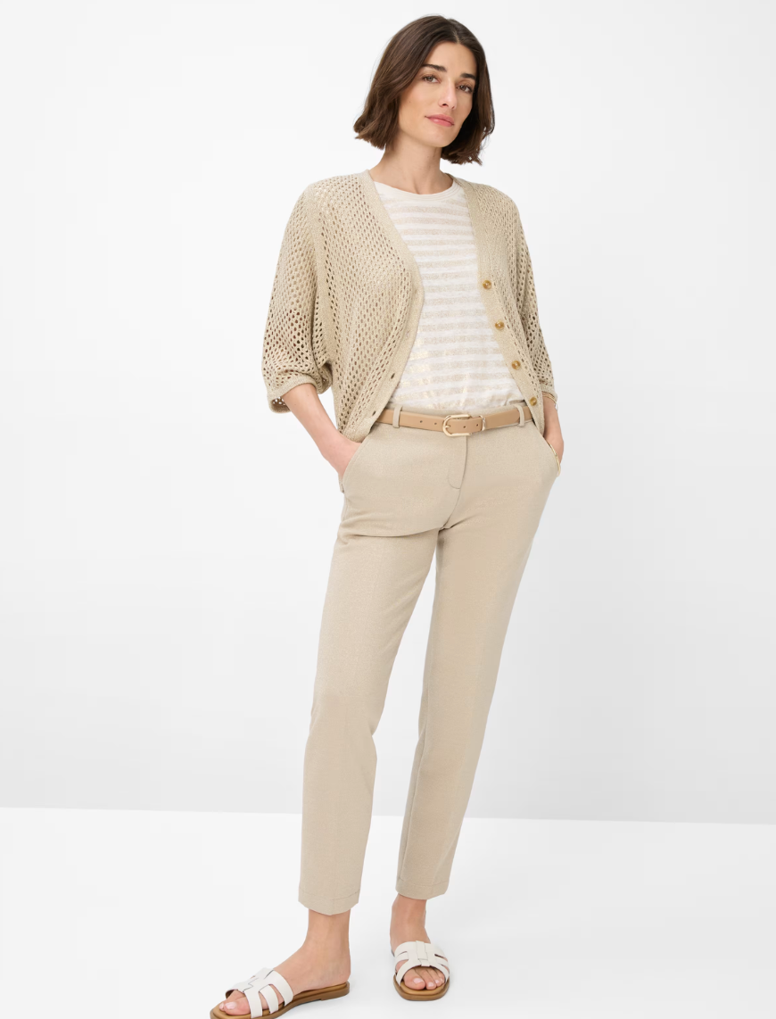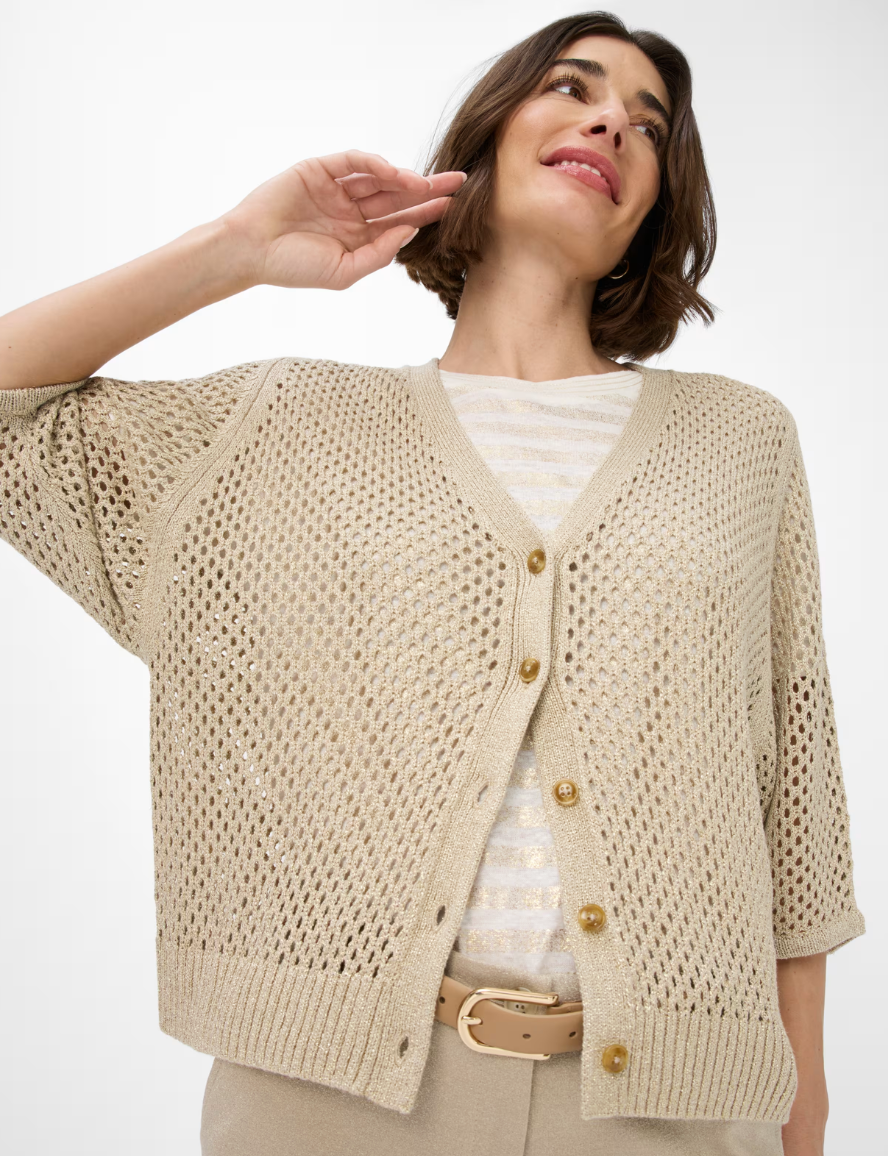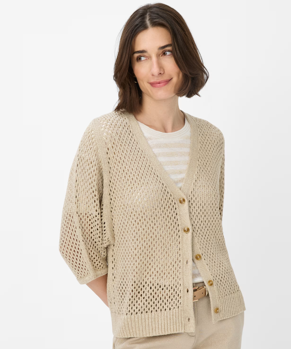 The Brax Alice Cardigan combines modern elegance with subtle glamour. Featuring a relaxed fit with dropped shoulders, a deep V-neckline, and a delicate button placket, it offers effortless style. The 3/4-length sleeves and airy ajour pattern, accentuated by fine Lurex threads, provide a refined shimmer and breathable comfort. Expertly shaped for a feminine silhouette, this lightweight knit is ideal for layering or enhancing summer outfits with sophistication and ease.