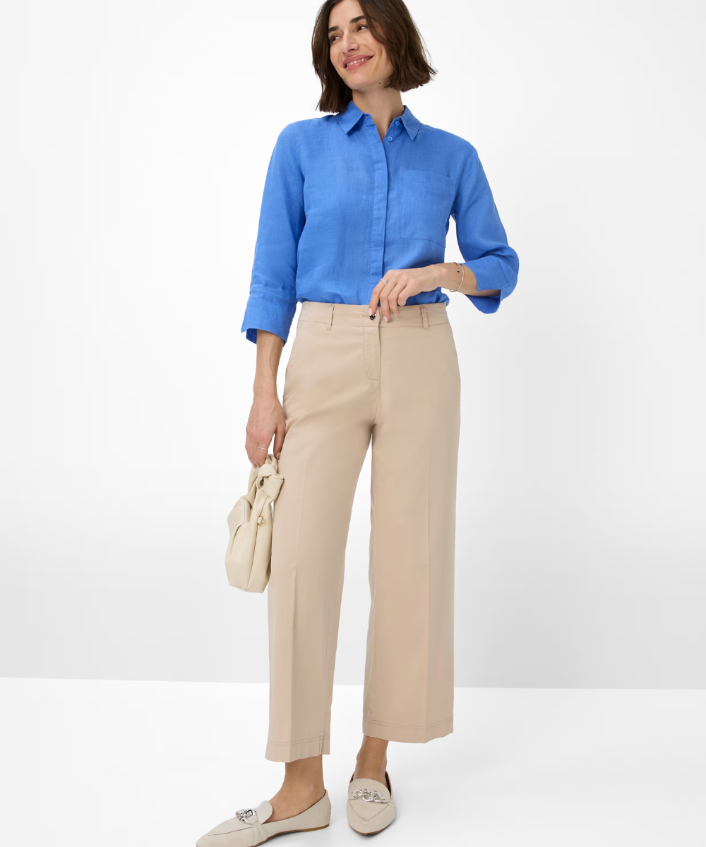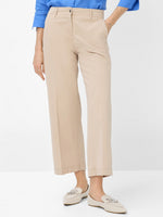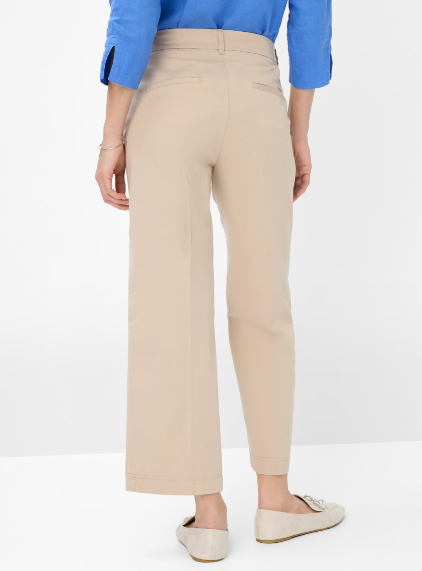 These Brax Maine beige trousers combine fashion and comfort with a straight, wide-leg cut and regular waist for a relaxed, yet polished look. Designed with detailed pockets and elegant creases, they enhance your style whether paired with heels or sneakers. Crafted from an ultralight, soft, and durable cotton blend featuring a satin finish and atlas weave, these culottes offer a luxurious shine and skin-friendly feel, ensuring exceptional comfort and lasting wear. Perfect for those seeking a refined yet effortless wardrobe staple.