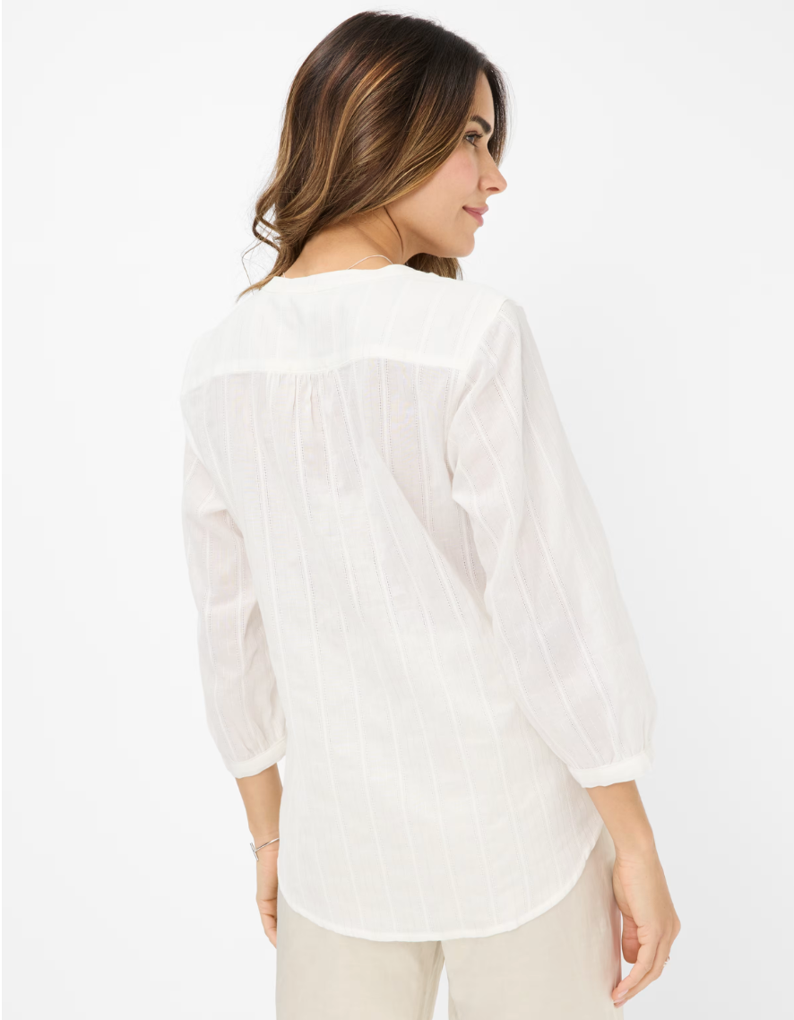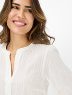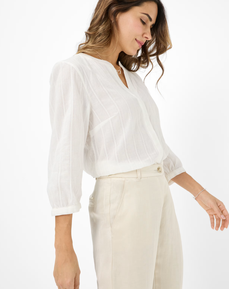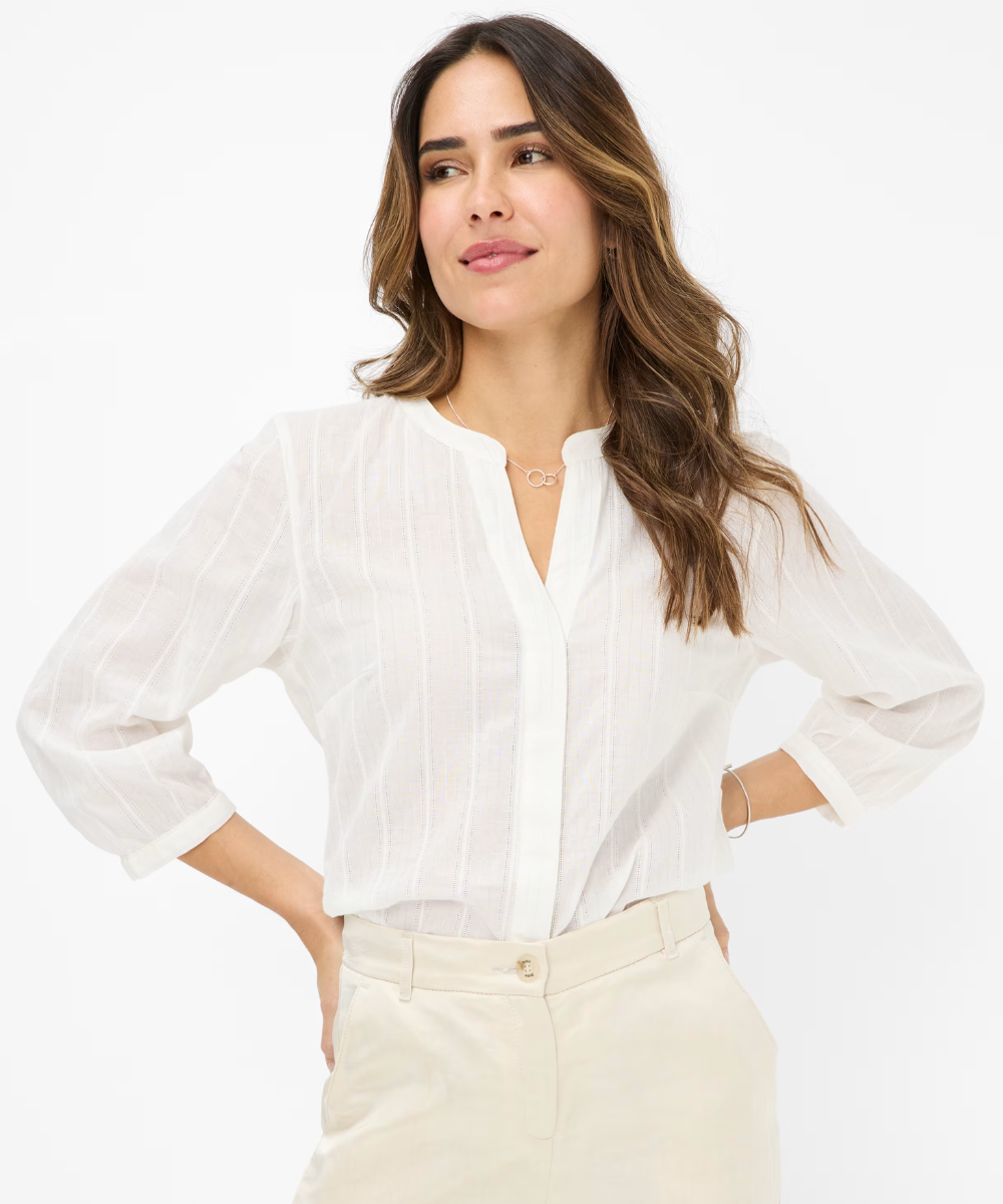 The Brax Velia White Top blends airy summer lightness with modern refinement. Crafted from breathable, high-quality cotton poplin, its relaxed tunic neckline and straight silhouette offer comfort and style. The concealed button placket ensures a neat look, while 3/4-length sleeves enhance its casual versatility. Fine tonal stripes accentuate the semi-transparent fabric and the rounded hem, with delicate back gathers adding a feminine flow. This blouse is an expert choice for a breathable, lightweight garment that seamlessly combines trend-aware design with summer-friendly comfort.