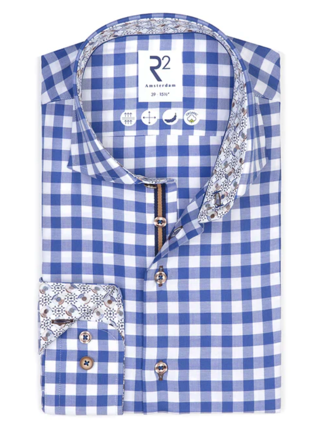 This R2 Amsterdam GINGHAM LS SHIRT features a classic blue Vichy check pattern, originating from the area of Vichy outside of Paris. Expertly crafted, this shirt combines timeless style with quality materials for a professional and sophisticated look. Perfect for any occasion.
