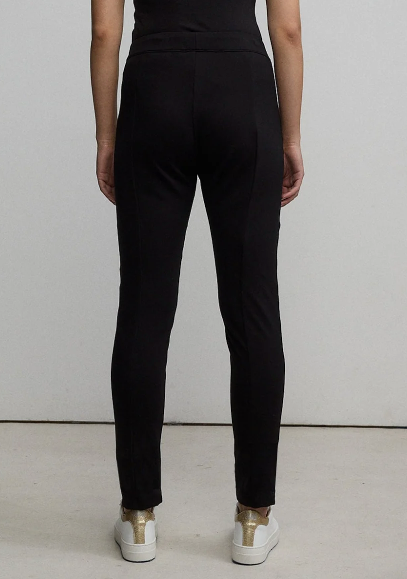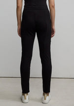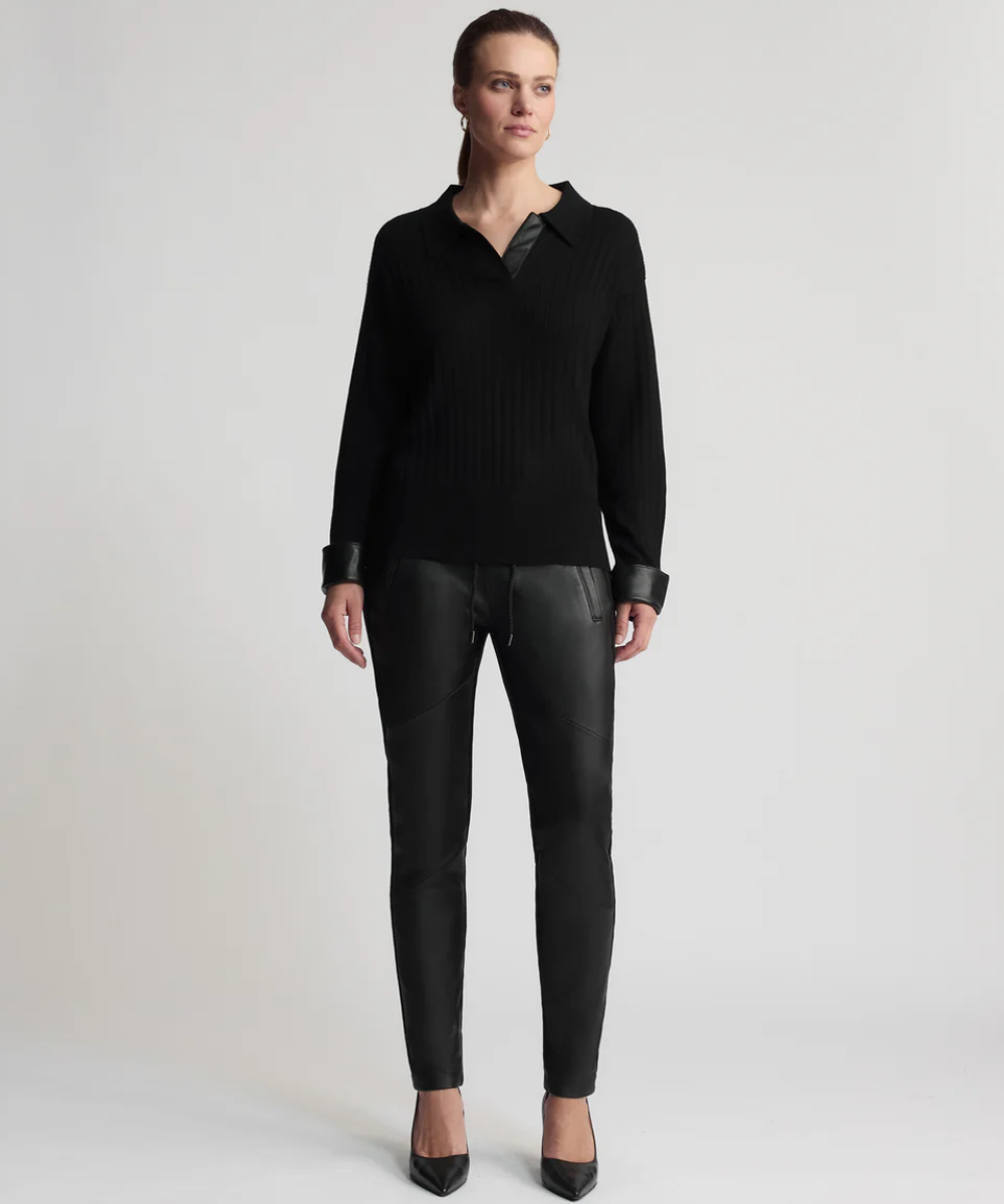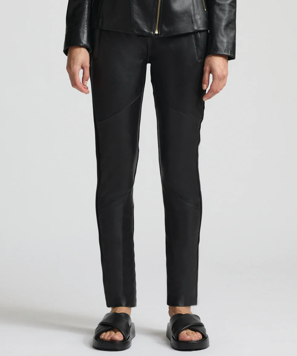 Indulge in luxury and sophistication with the Frankie Black Leather Pants. Made with Italian leather and stretch knit ponte, these jogger pants offer a comfortable high-rise waist. Versatile in style, the waist can be worn lower for a harem pant look or higher for a straight pant appearance. The carefully positioned waistband, tailored panelling, and black matte zip hardware elevate the overall look and feel of these pants. Experience comfort and movement with every wear.
