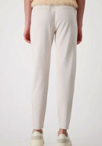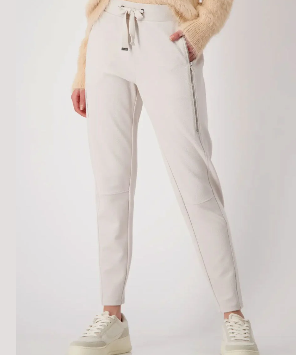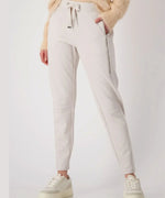 Introducing our Monari Cream Pants, crafted from a sustainable EcoVero viscose blend with elastic jersey rib fabric. Designed for a slim fit, these drainpipe trousers offer both style and comfort with extended side zip pockets and a practical elasticated waistband with tie ribbon. Elevate your wardrobe with these luxurious, environmentally-friendly pants.
