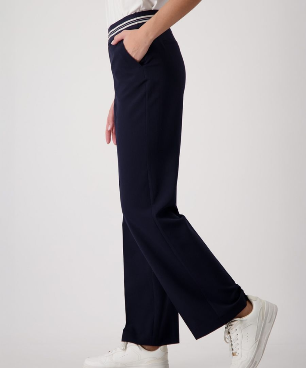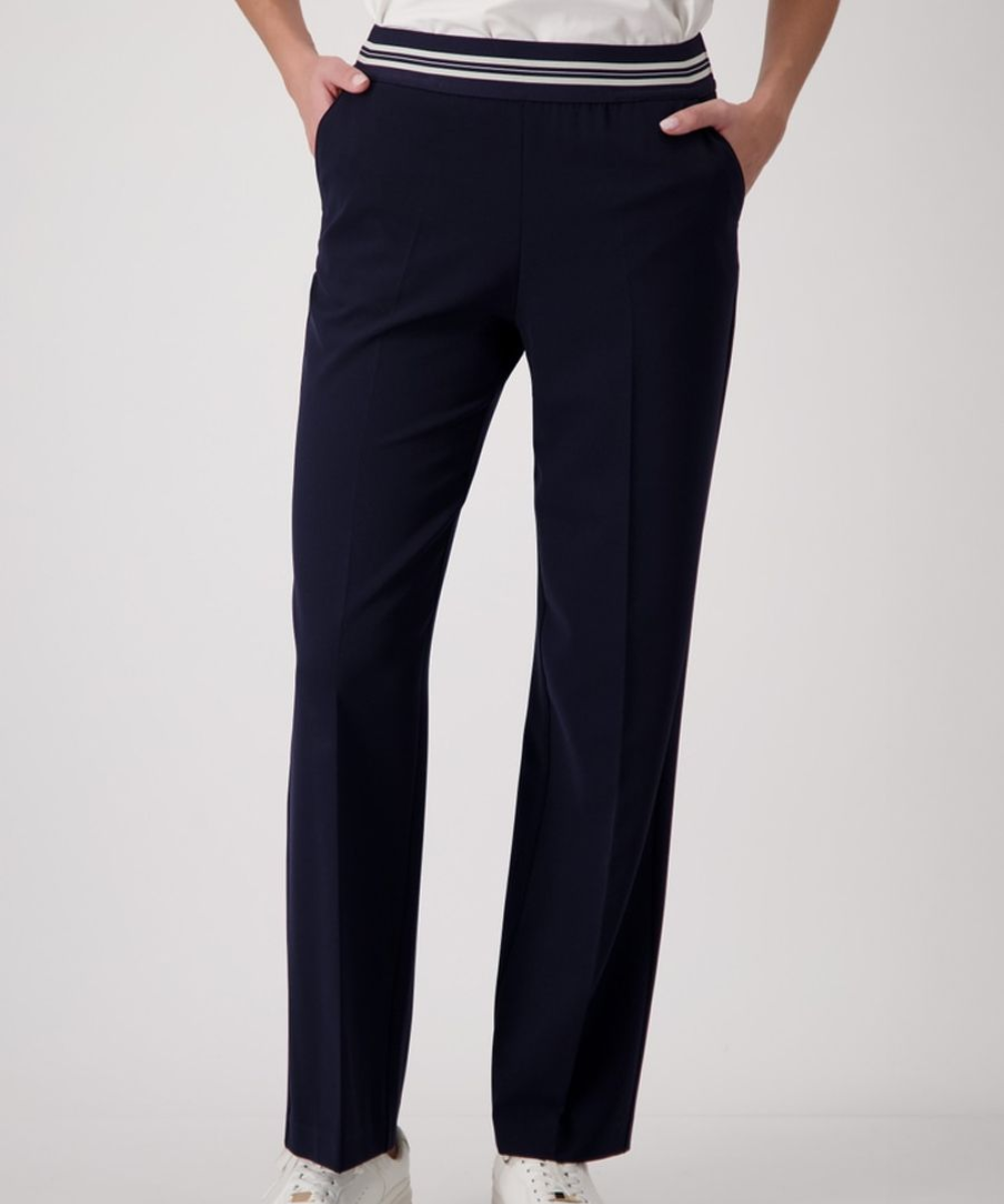 These Monari pants feature a full-length, straight-leg design with pressed centre seams for a sleek, structured look. The elasticated waistband ensures comfort, while in-seam side pockets add practicality. Crafted in a deep navy shade, they offer a sophisticated alternative to casual joggers. Perfectly versatile, pair them with a striped knit top and sneakers for relaxed weekends or elevate your office attire with a tucked-in blouse and loafers.