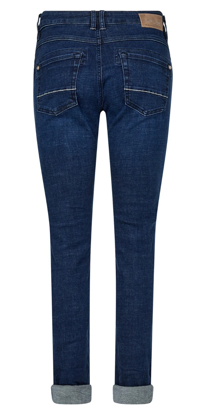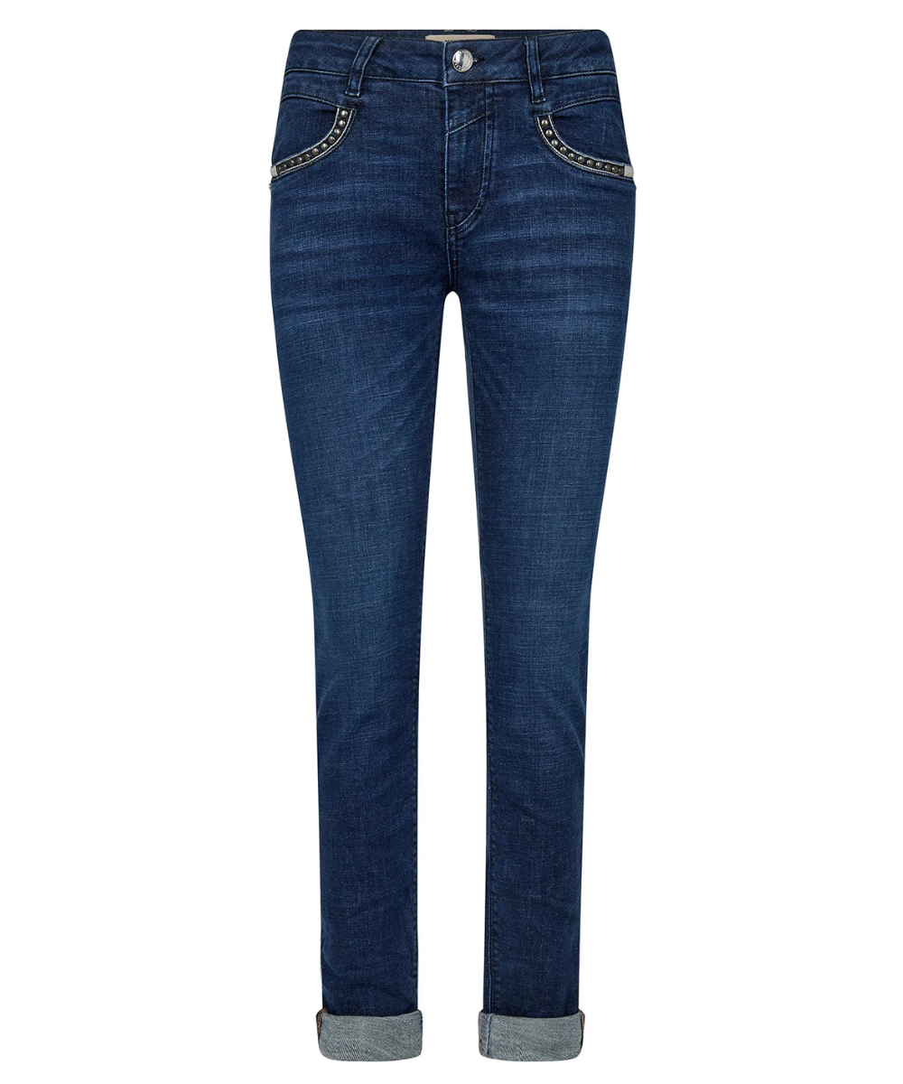 Elevate your style with the Mos Mosh Naomi Cadillac Jeans in dark blue. These mid-rise jeans feature a tailored tapered fit that flatters every silhouette. Distinctive silver studs on the low front pockets and silver-thread detailing on the back pockets add sophisticated edge and subtle glamor. Perfectly paired with a sleek tee and cropped blazer, they bring a refined rock’n’roll vibe to any wardrobe.