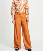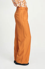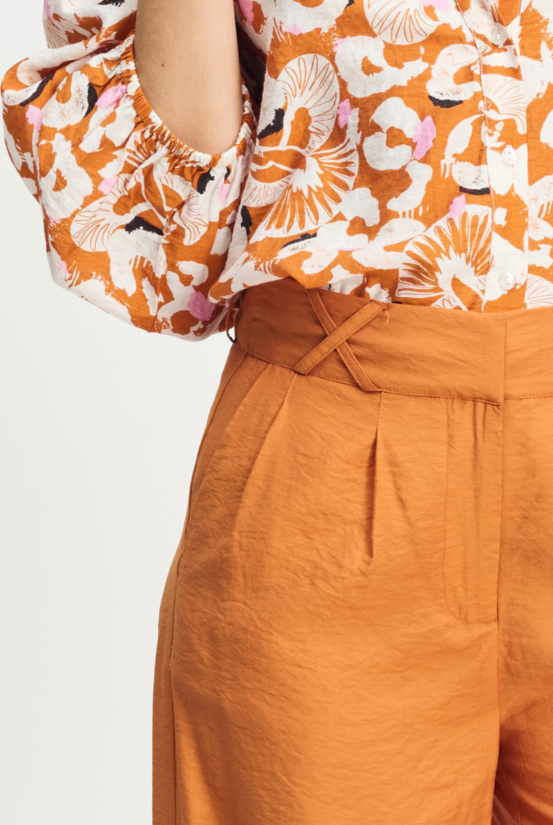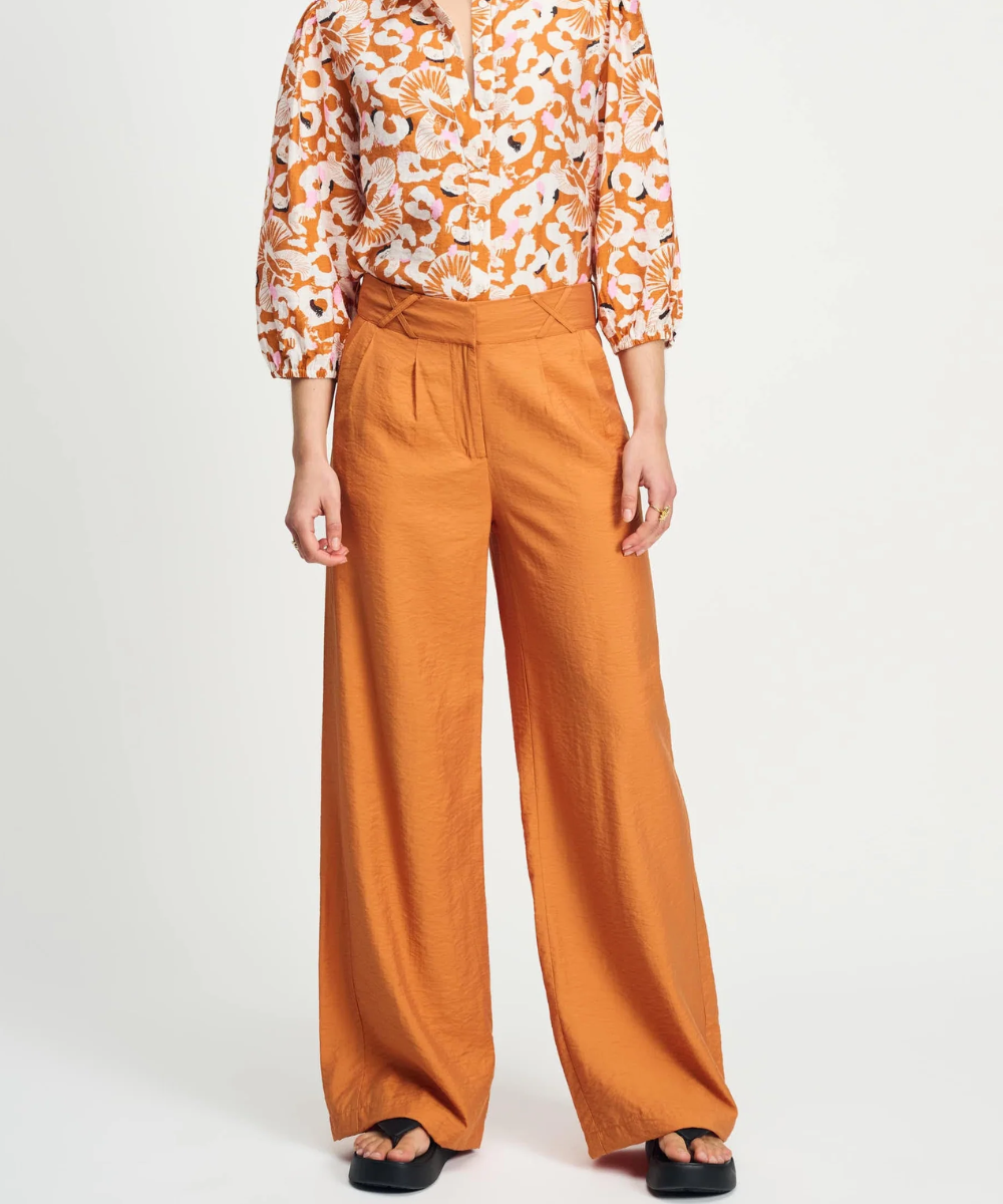 These POM Sienna Brown Pants feature a wide-leg design with pleats and crossed front belt loops, combining style and comfort. Crafted from 84% LENZING™ ECOVERO™, they offer breathability ideal for warmer weather while supporting sustainability. Practical side pockets and a hook-and-eye closure complete this versatile, eco-conscious wardrobe essential.
