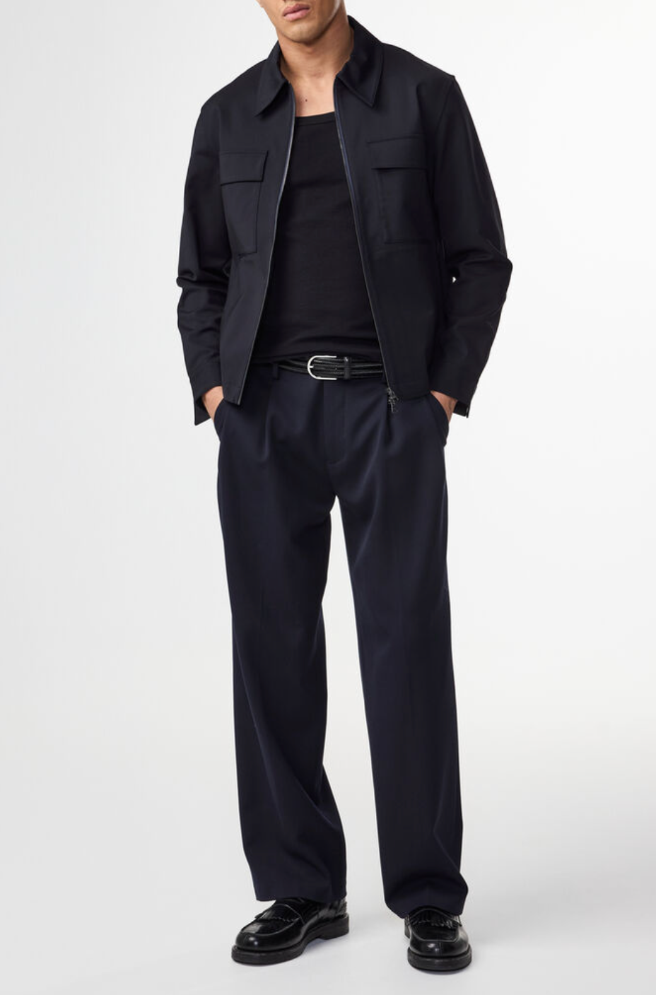 The NN07 Alban Jacket combines premium comfort with functional design. Crafted from a carefully balanced blend of 50% cotton, 47% polyamide, and 3% elastane, this navy piece offers breathability and durability with subtle stretch for unrestricted movement. The two-way zip provides versatile styling options—wear it fully closed for structured layering or partially open for a relaxed aesthetic. A refined collar completes the sophisticated silhouette, making it an essential transitional layer for discerning wardrobes.