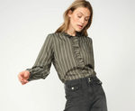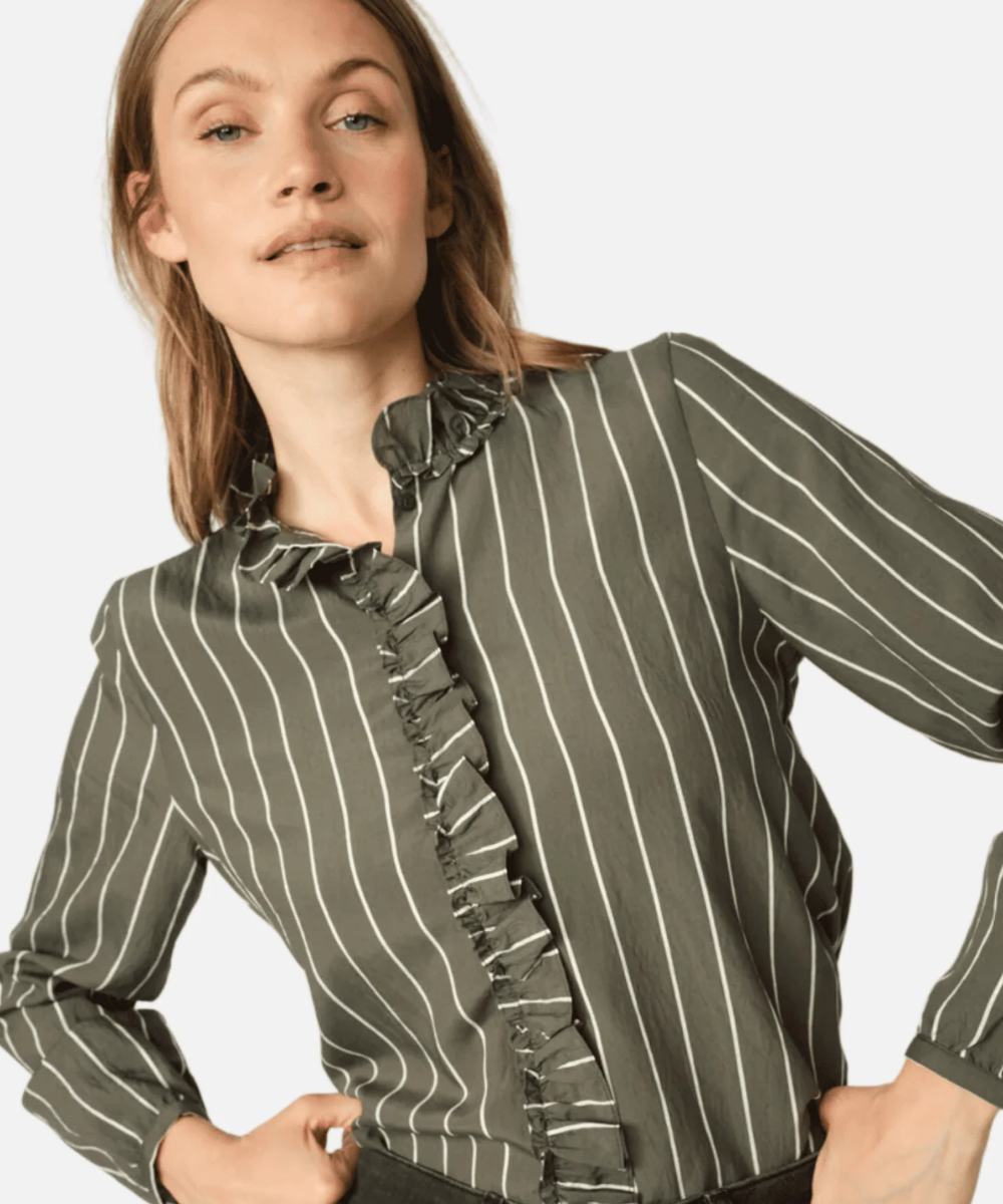 The Mos Mosh Billy Stripe Shirt combines timeless appeal with refined details. Cut in a regular fit, this striped design features a hidden button closure framed by delicate ruffles at the neckline for added sophistication. Buttoned cuffs complete the polished silhouette. Versatile enough to transition from tailored trousers and structured blazers to denim and casual separates, it's an essential piece for building a cohesive wardrobe with understated elegance.