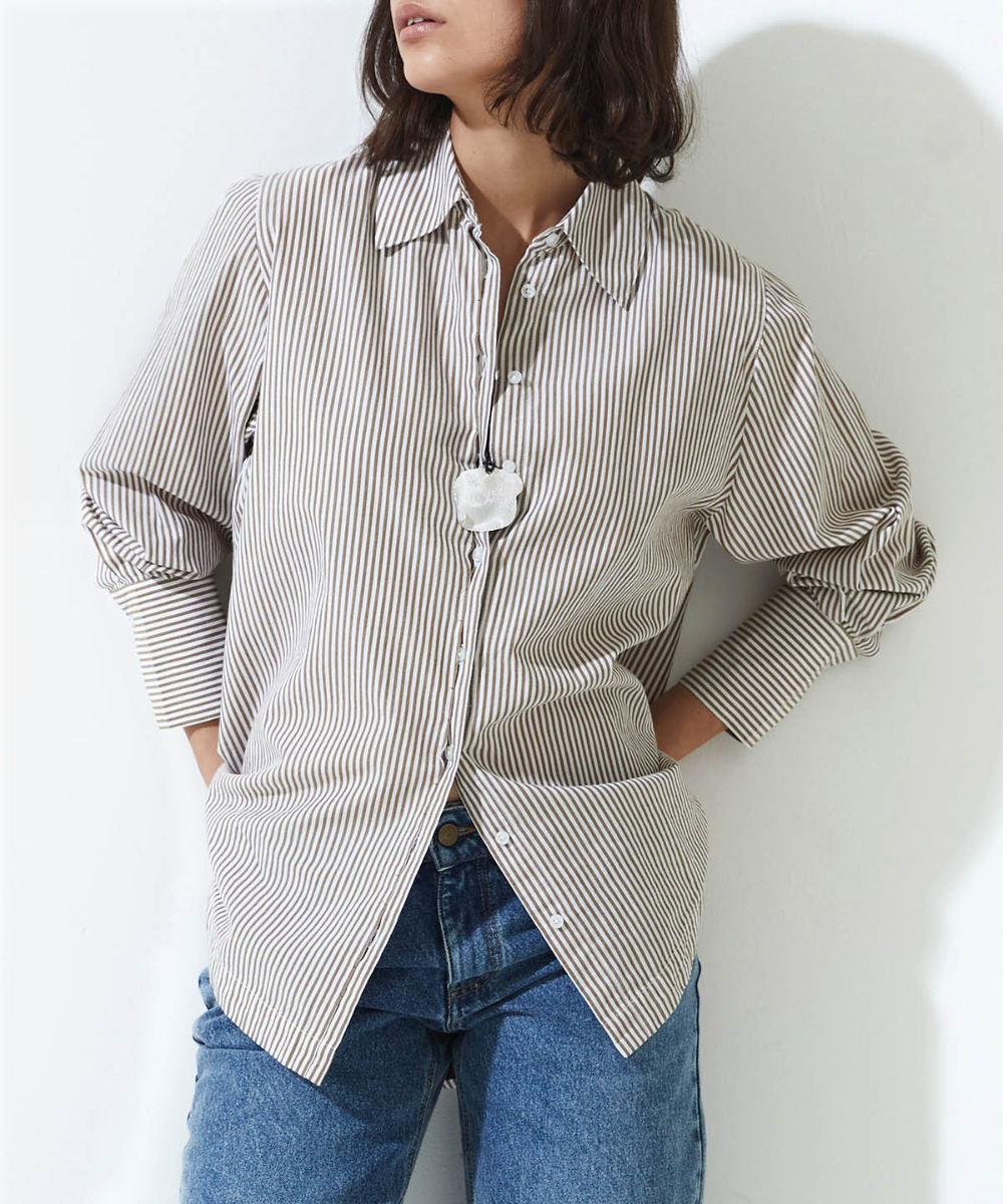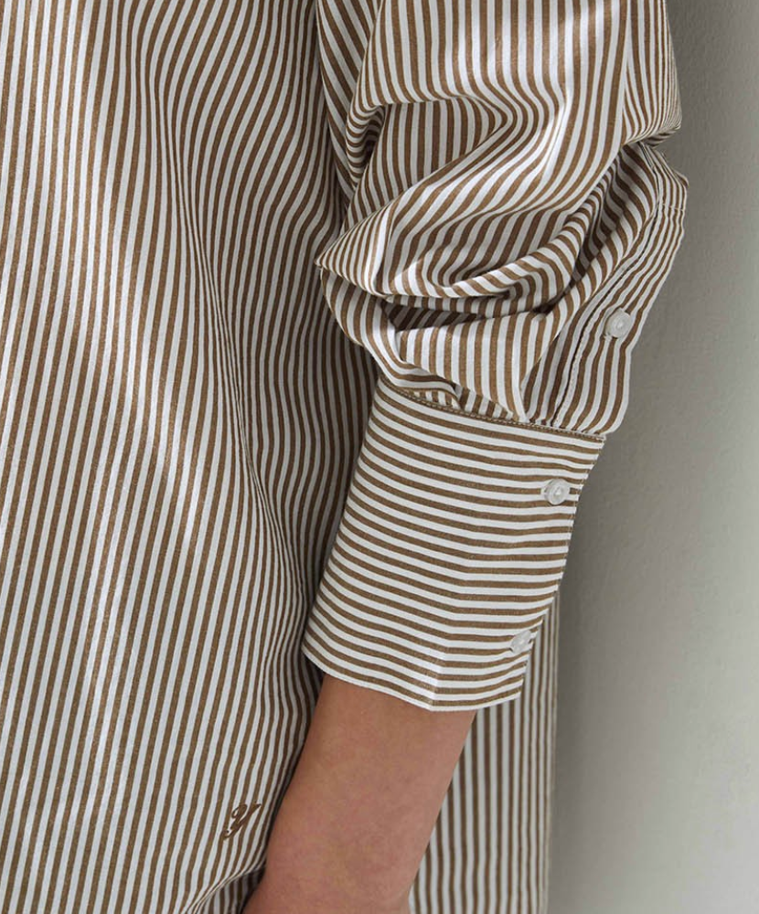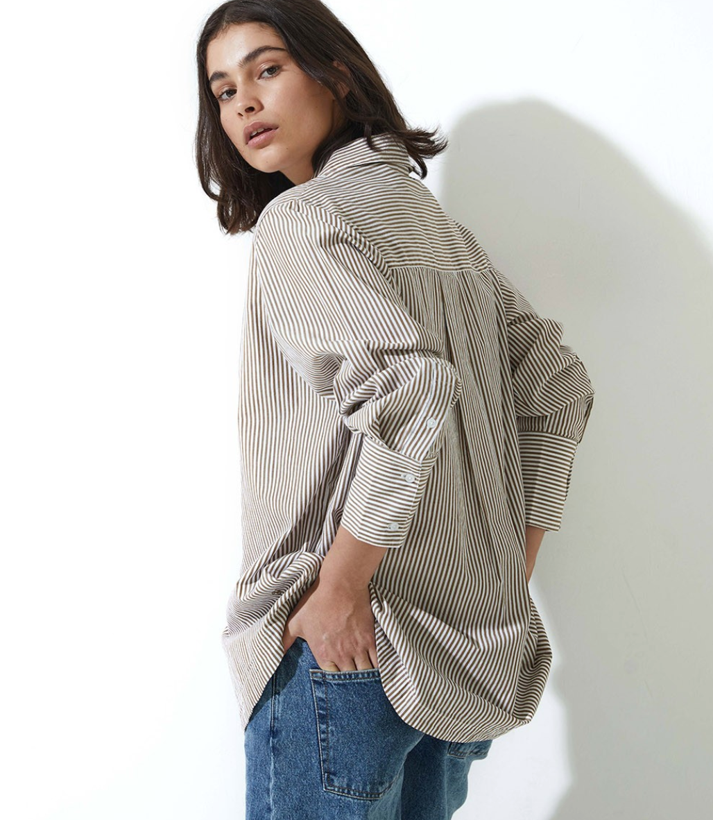 Crafted from 100% organic cotton, this oversized popelin shirt combines timeless tailoring with contemporary ease. The refined striped print and generous cut deliver effortless sophistication, while mother-of-pearl buttons and button cuffs add understated luxury. A pleated back panel enhances movement and silhouette, making this a versatile piece that transitions seamlessly from casual to polished occasions. Long sleeves and a structured collar complete the design.