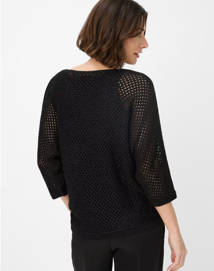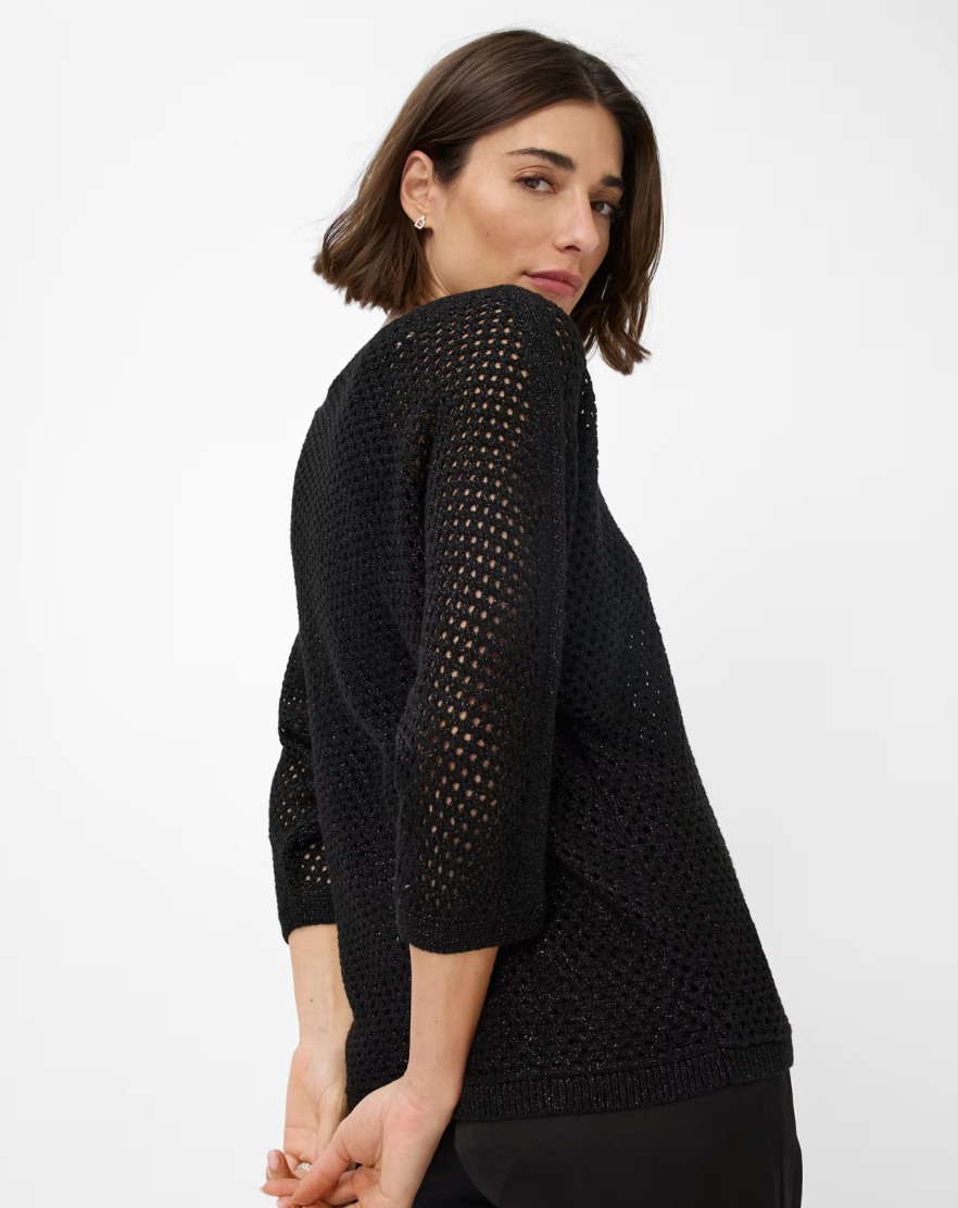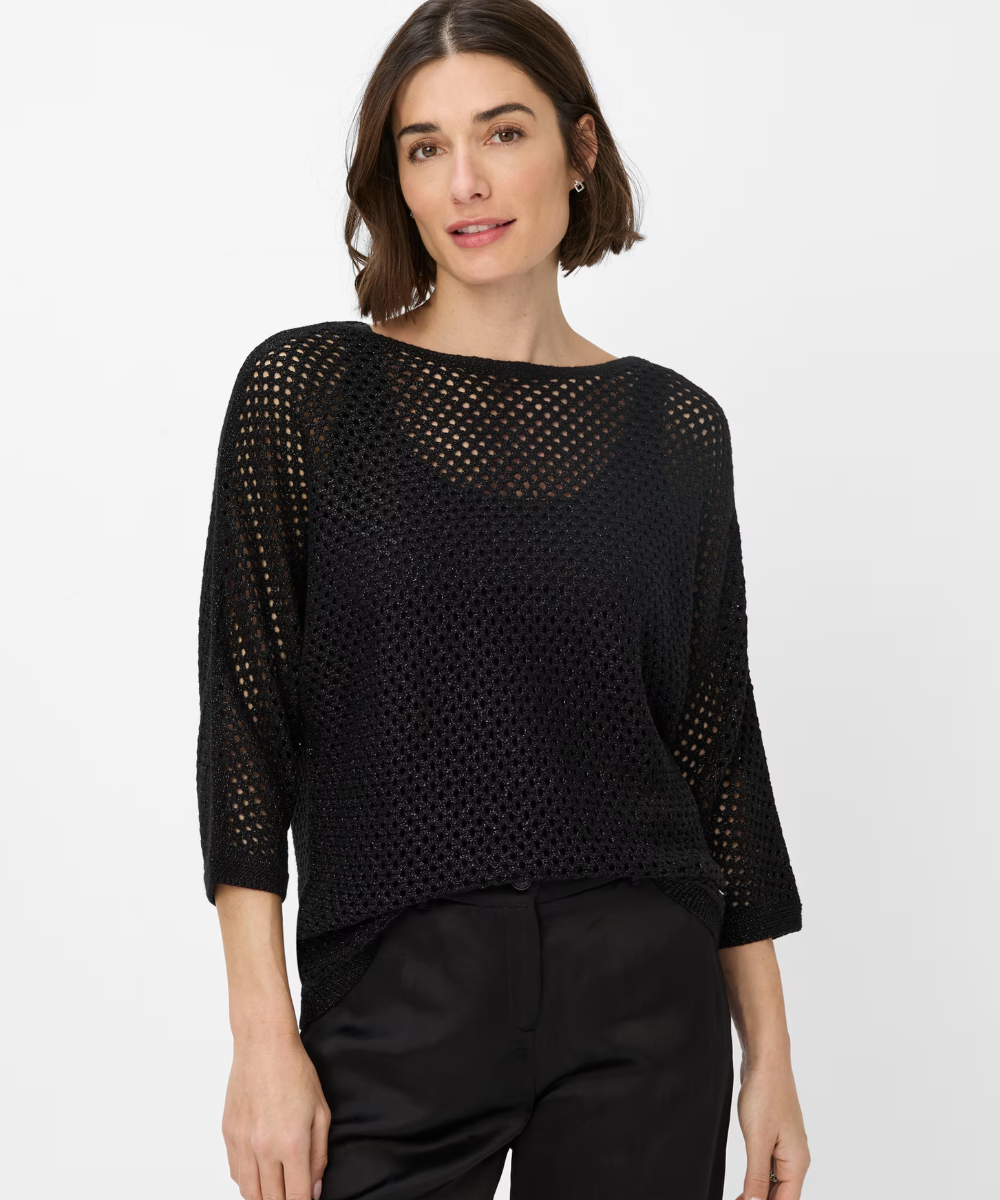 The Brax Emma Jumper combines sophisticated knit craftsmanship with contemporary design. Featuring an oversized silhouette and dropped shoulders, it offers a relaxed yet elegant fit highlighted by its chic boat neckline. The 3/4 length sleeves and delicate ajour pattern with subtle Lurex threads create a refined texture and gentle shimmer, perfect for a feminine, trend-conscious look. Ideal for layering over tops or pairing with flowing trousers, this jumper brings effortless style and premium quality to your spring wardrobe.