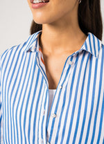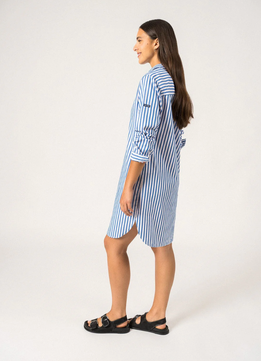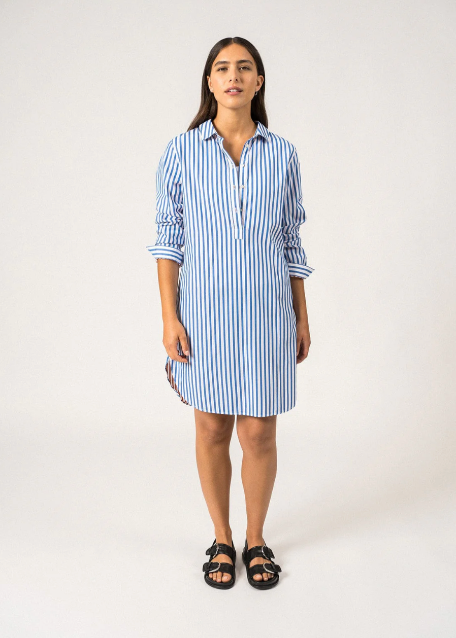 The 100% cotton Benedicte II dress is tailored for elegance and comfort. It features a playful double-faced stripe design - blue on the outside and vibrant orange inside. Its long sleeves and full button placket blend functionality with flair. Dress down with flats for daytime charm or accessorise with bold jewellery and heels for an evening out.